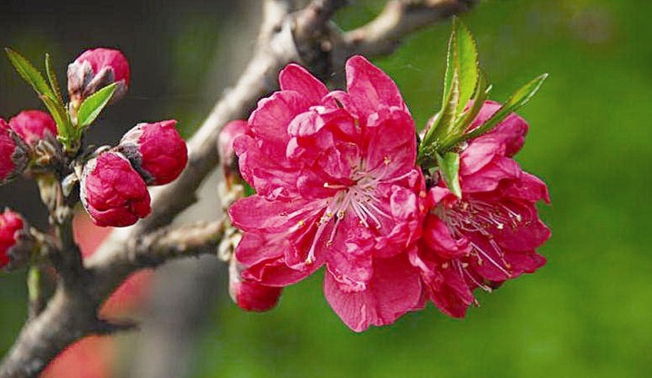 桃花,屬薔薇科,落葉小喬木,高可達6一8米。樹干灰褐色,粗糙有孔。小枝紅褐色或褐綠色,平滑。葉橢圓狀披針形,邊緣有細鋸齒。花單生,有白、粉紅、紅等色,重瓣或半重瓣,花期3月。核果近球形,表面密被短絨毛,因品種不同,果熟6一9月。